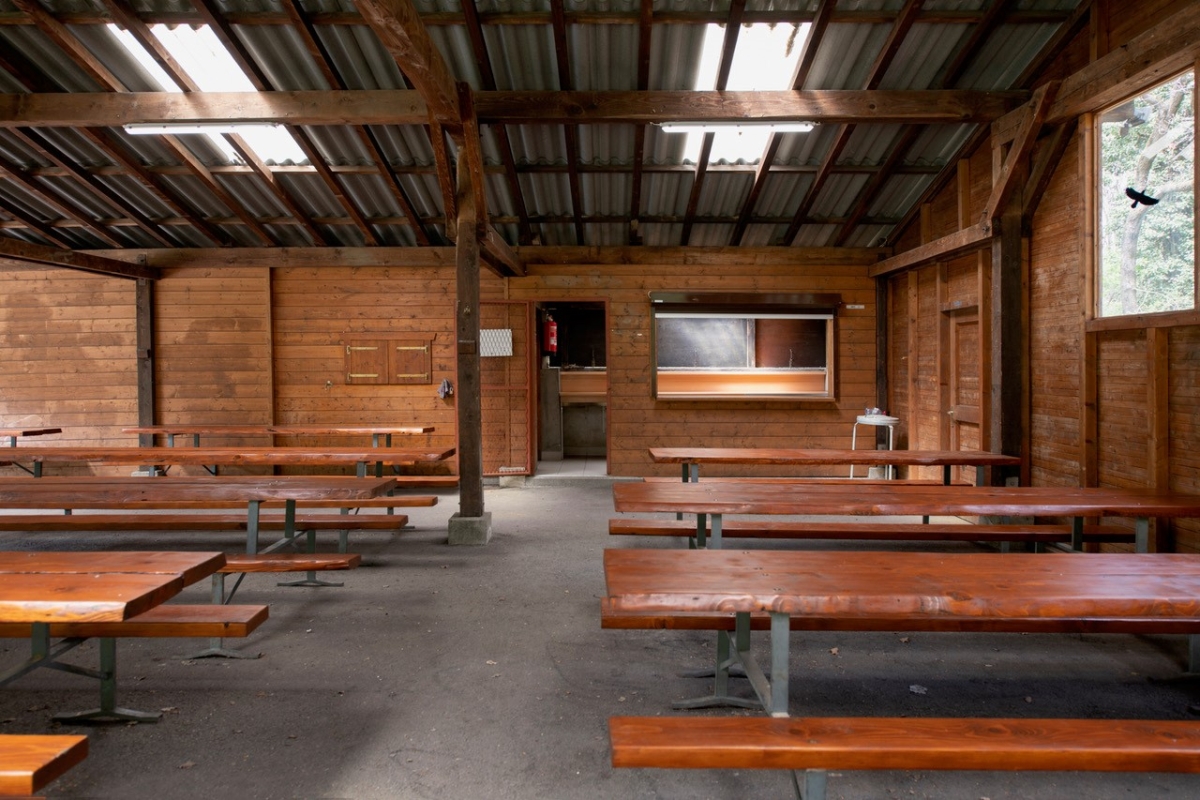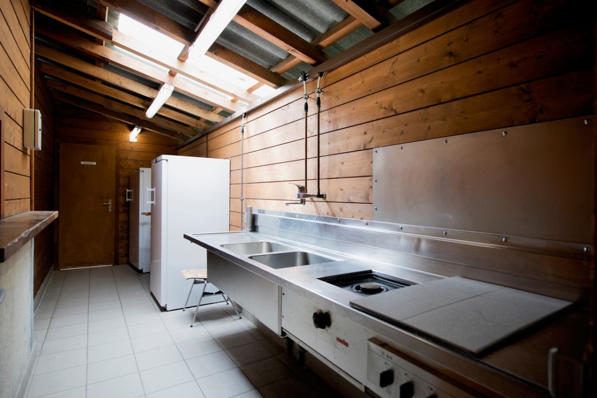 Il dispose d'un local fermé avec plonge et eau courante (chaude et froide), de tables, de bancs, d'un gril à charbon de bois, de deux plaques électriques, de deux grands frigos, de deux WC, d'un éclairage et de rideaux de fermeture en toile.